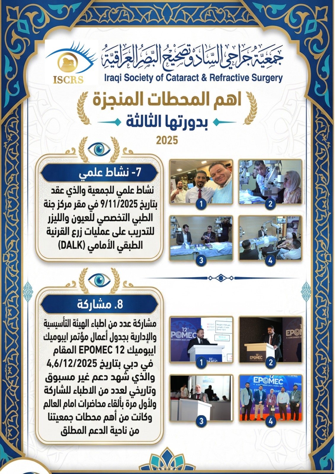 شهد العام مسيرةً حافلة بالعطاء والإنجازات، عكست التزام جمعية جراحي الساد وتصحيح البصر العراقية بتطوير واقع طب العيون في العراق، عبر تنظيم المؤتمرات العلمية، والورش التدريبية، والأنشطة التوعوية التي أسهمت في تعزيز كفاءة الأداء المهني والارتقاء بخدمة المرضى