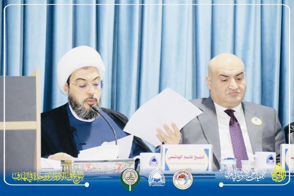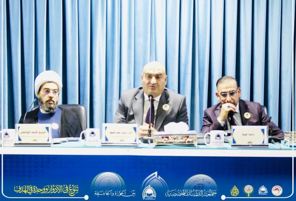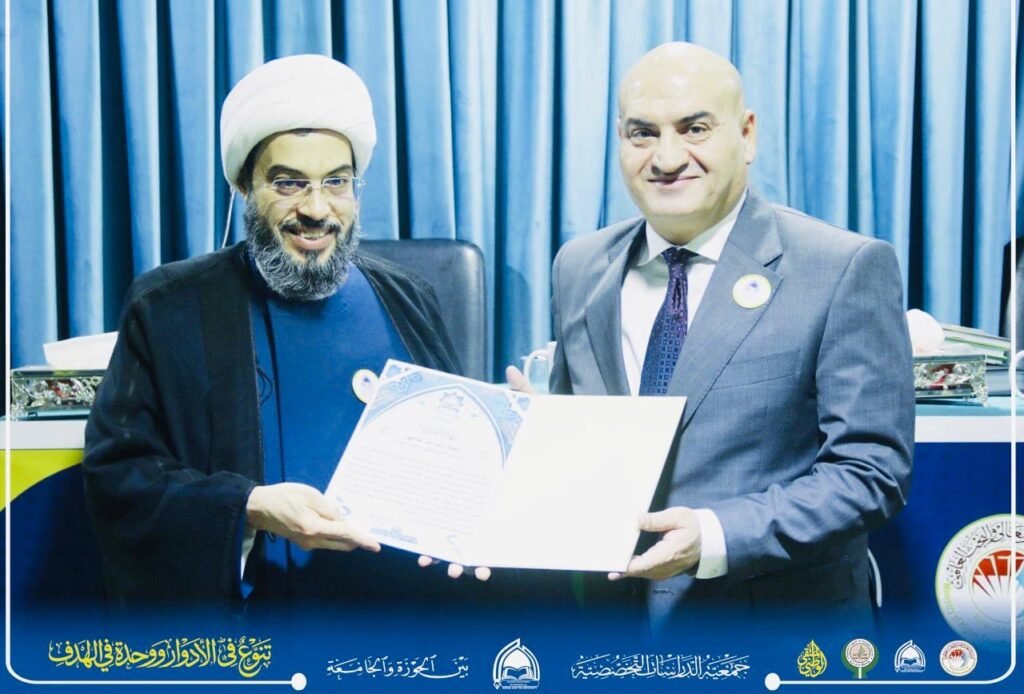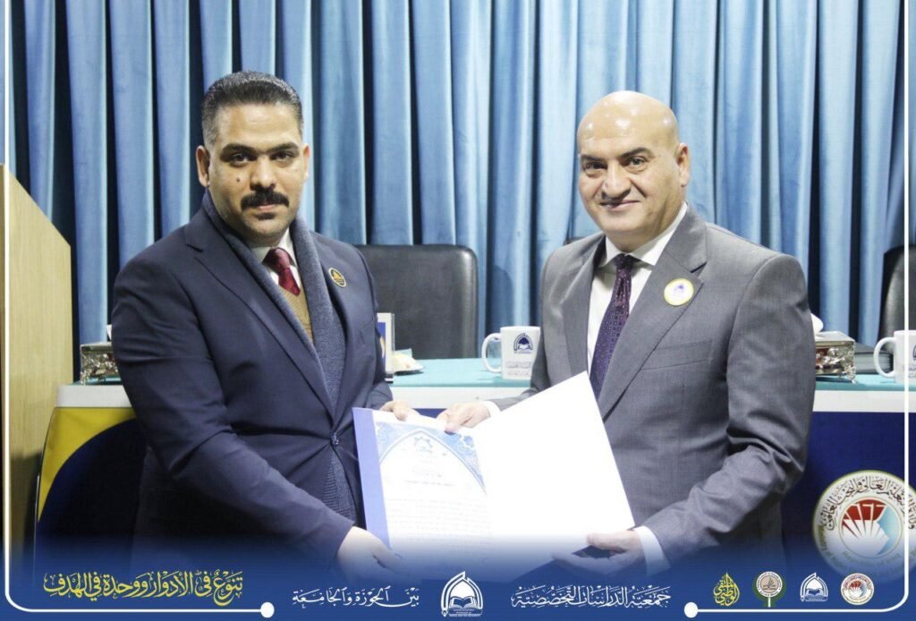 كما يسرّنا أن نعبّر عن بالغ الشكر والامتنان للأستاذ الدكتور حيدر عبد ضهد، رئيس المجلس الأعلى للجمعيات العلمية، تقديرًا لرؤيته القيادية ودعمه التنظيمي البنّاء، وإلى الشيخ قاسم الهاشمي، رئيس جمعية الدراسات التخصصية بين الحوزة والجامعة، عرفانًا بعطائه المؤسسي وجهوده الميدانية التي أسهمت في تعزيز الحضور العلمي وترسيخ مكانة الجمعية.