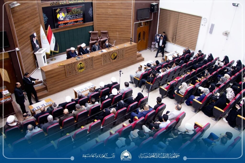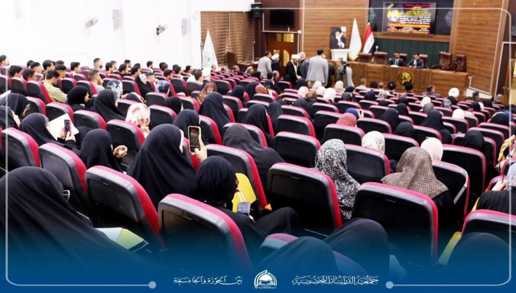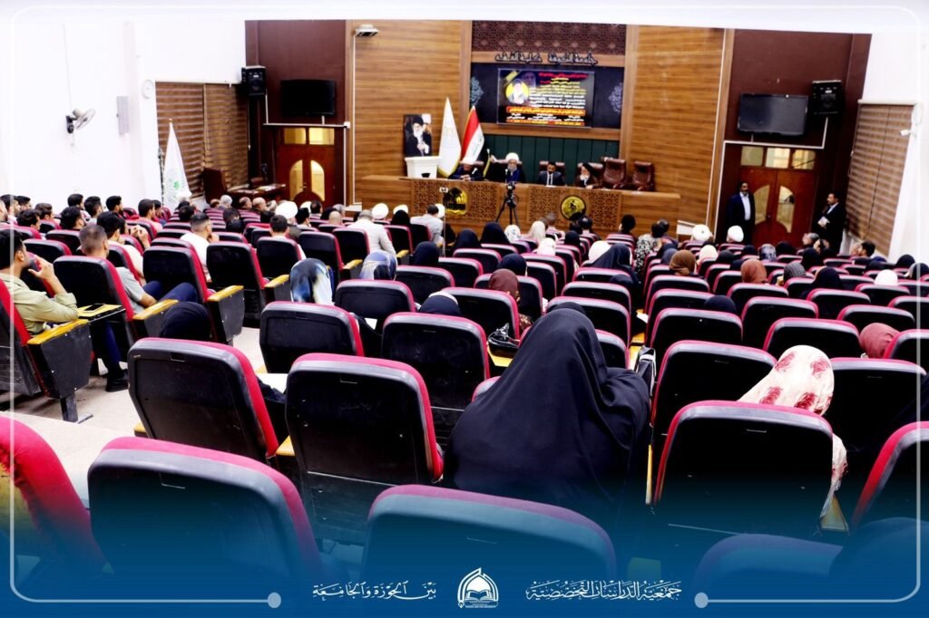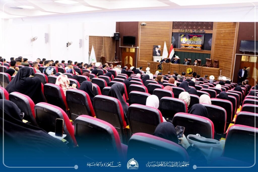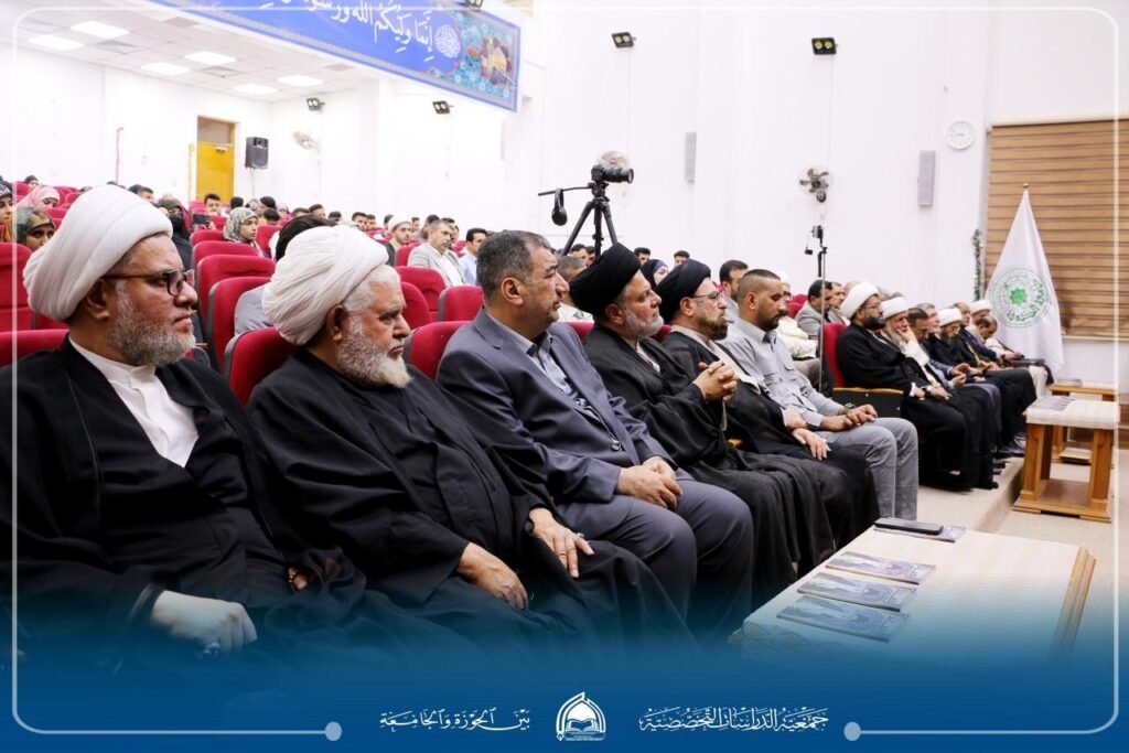 “معالم النهضة الفكرية في فكر سماحة الإمام السيد الخامنئي وأثرها في الوسط الجامعي”، بحضور رئيس الجامعة الأستاذ الدكتور علاء المولى، وعميد كلية الفقه الأستاذ الدكتور سليم الجصاني، وممثل الإمام الخامنئي في العراق سماحة آية الله مجتبى الحسيني، وسماحة الشيخ قاسم الهاشمي رئيس الجمعية إلى جانب حضور نخبة من أساتذة الجامعة وطلبتها ومدراء المؤسسات الثقافية والمراكز العلمية، وممثلي الحوزات العلمية ومراجع الدين العظام.