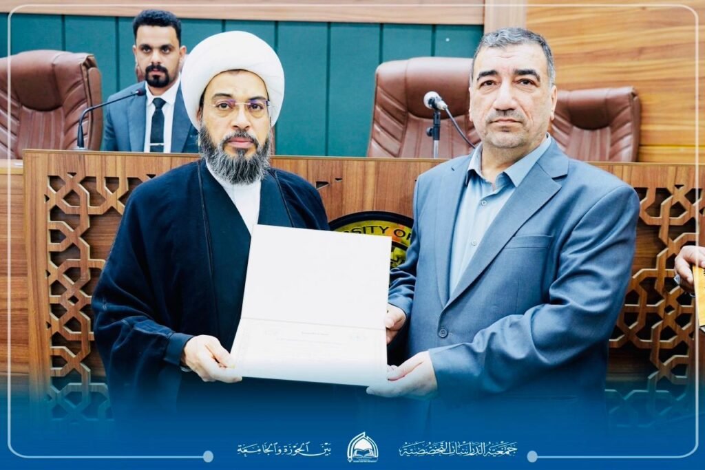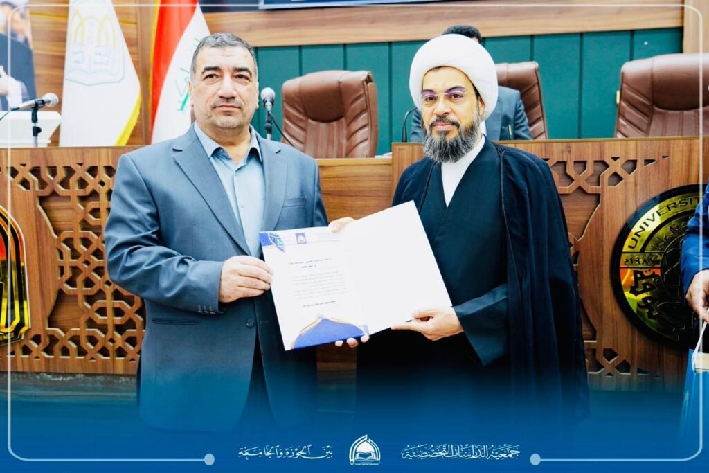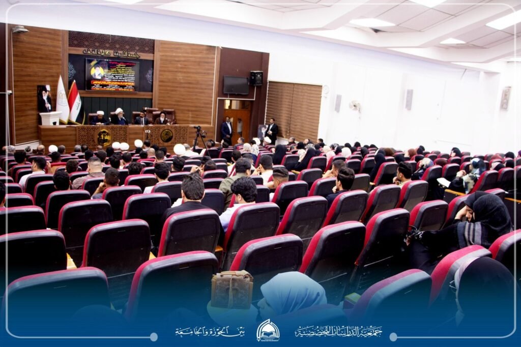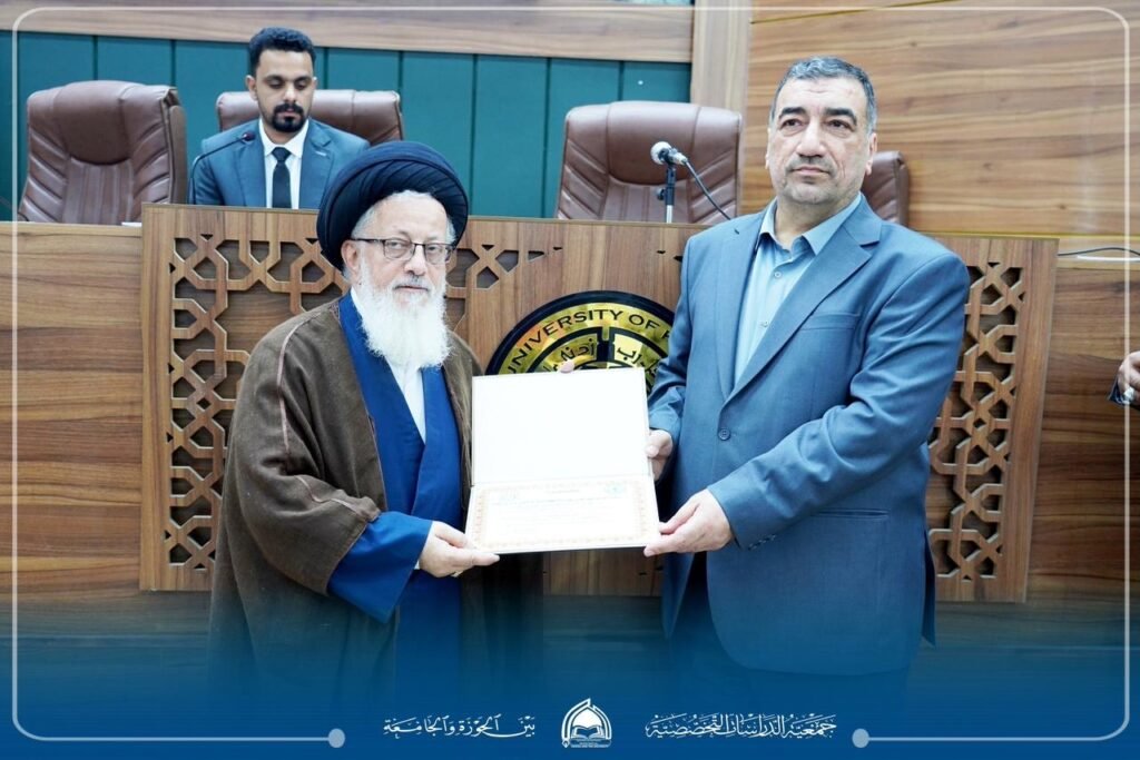“معالم النهضة الفكرية في فكر سماحة الإمام السيد الخامنئي وأثرها في الوسط الجامعي”، بحضور رئيس الجامعة الأستاذ الدكتور علاء المولى، وعميد كلية الفقه الأستاذ الدكتور سليم الجصاني، وممثل الإمام الخامنئي في العراق سماحة آية الله مجتبى الحسيني، وسماحة الشيخ قاسم الهاشمي رئيس الجمعية إلى جانب حضور نخبة من أساتذة الجامعة وطلبتها ومدراء المؤسسات الثقافية والمراكز العلمية، وممثلي الحوزات العلمية ومراجع الدين العظام.