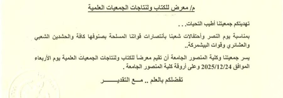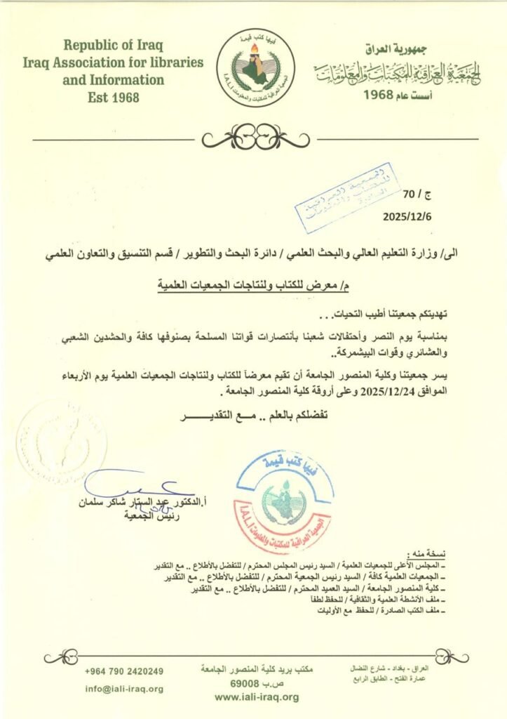 تدعو الجمعية العراقية للمكتبات والمعلومات جميع الجامعات والمؤسسات العلمية والبحثية للمشاركة في معرض الكتاب ومنتجات الجمعيات العلمية الذي يقام بالتعاون مع كلية المنصور الجامعة، وذلك يوم الأربعاء الموافق 24 كانون الأول 2025 في أروقة الكلية.