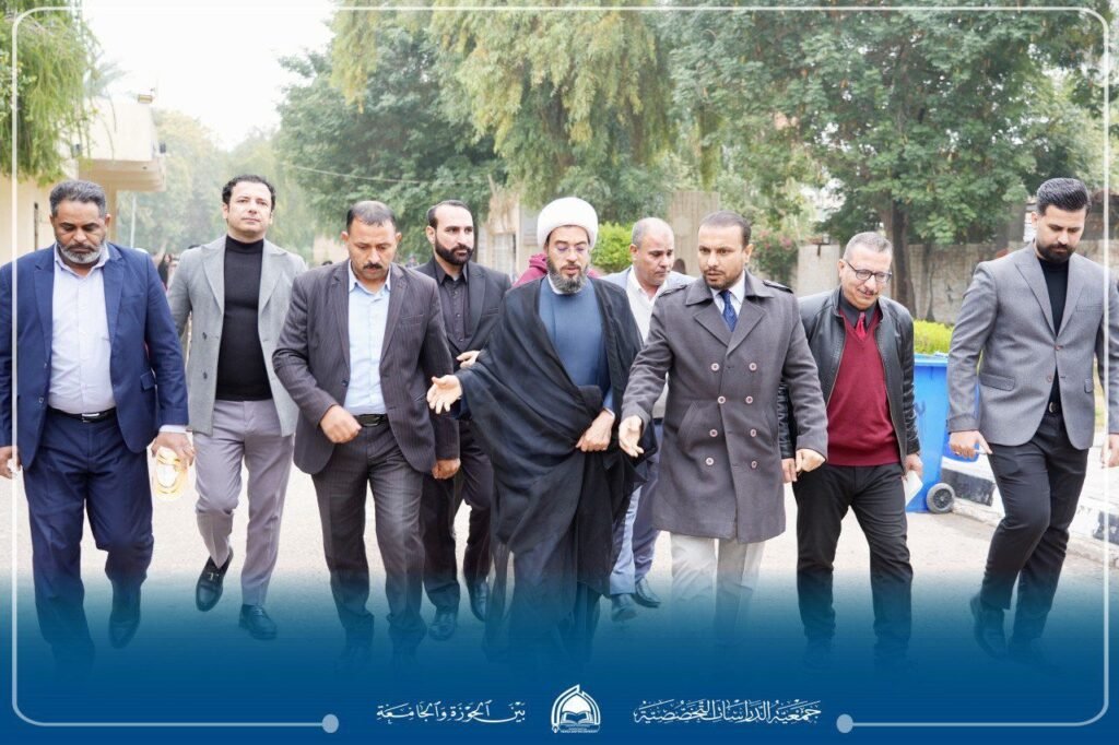 يرافقه وفدٌ رسمي، حيث كان في مقدمة مستقبليه السيد عميد كلية القانون الأستاذ الدكتور مالك الحسيني، وممثل الجامعة في الجمعية الدكتور محمد مهنا عبد الرضا، إلى جانب عدد من أساتذة الكلية.